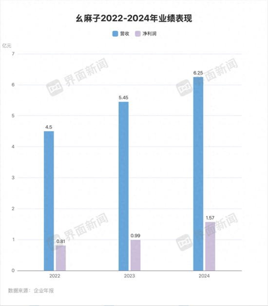 幺麻子设置于2008年,总部位于四川省眉山市洪雅县。在功绩线路方面,界面新闻梳理其招股书看到,幺麻子近三年呈现握续增长趋势。2022-2024年,幺麻子收尾贸易收入离别约为4.5亿元、5.45亿元、6.25亿元;对应收尾包摄净利润离别约为8116.45万元、9877.78万元、1.57亿元;毛利率离别为32.34%、33.3%、38.83%。