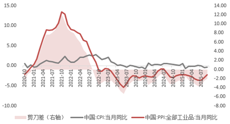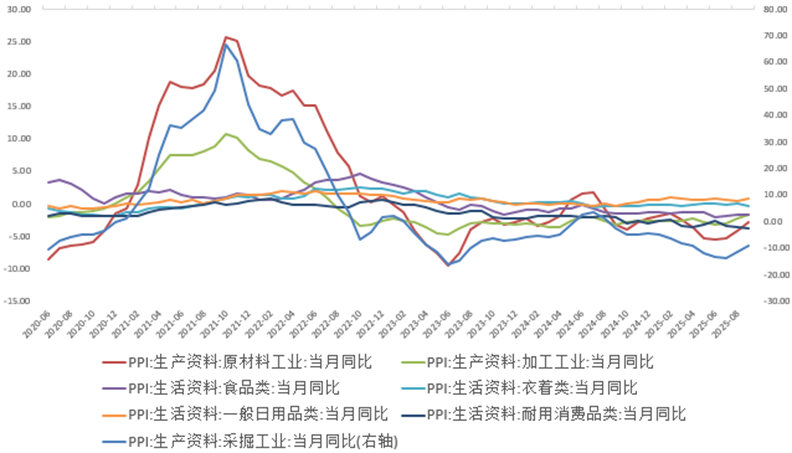 二、基数效应带动工业品价钱回升。9月PPI同比-2.3,预期-2.3%,前值-2.9%;环比握平,在客岁同时基数由-0.7%收窄至-0.1%的带动下,本月PPI跌幅有所收窄。从环比来看,在“反内卷”战略握续影响下,PPI防守踏实启动,一行此前跌势。分项看,受去产能程度激动影响,玄色金属采取与冶真金不怕火、煤炭采取与加工、有色采取与冶真金不怕火、光伏开拓与元器件、造纸业PPI环比高潮,涨幅为0.2-2.6%;而受外洋油价回落影响,石油自然气开采及加工业PPI下降较为显然。本月分娩贵府价钱同比下降2.4%,生计贵府价钱下降1.7%,剪刀差进一步收窄,险峻游材料价钱分化局势小幅好转。但剪刀差管理主要体当今分娩贵府端,不改卑鄙企业盈利能力较差,需求疲软特征恒久呈现。