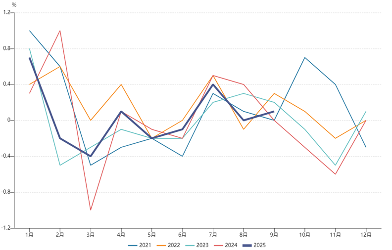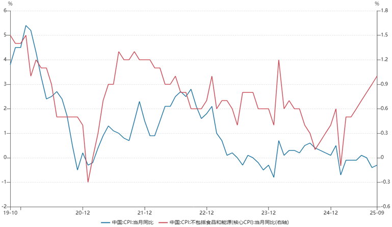 国度统计局10月15日公布的数据显现,9月CPI同比-0.3%,预期-0.2%,前值-0.4%;环比增长0.1%,增速上升0.1%。中枢CPI相接5月回升,同比高潮1%,涨幅比上月扩大0.1个百分点,为近19个月以来涨幅初次回到1%。PPI同比下降2.3%,预期-2.3%,前值-2.9%,环比相接两月握平。